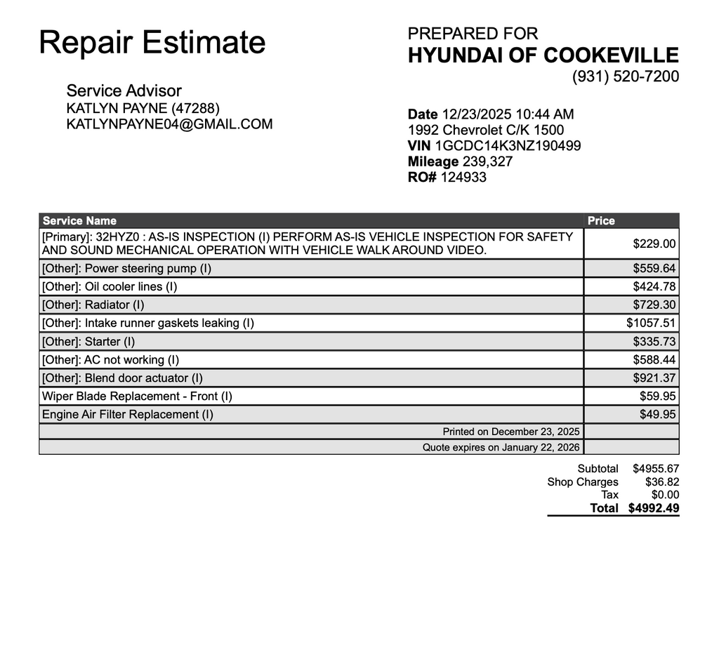 Thank you for choosing Hyundai of Cookeville!!!! Where we are creating happy buyers every day!! All of our preowned vehicles have gone through a multi point inspection by our certified trained technicians and have been professionally detailed!! 1992 Chevrolet C/K 1500