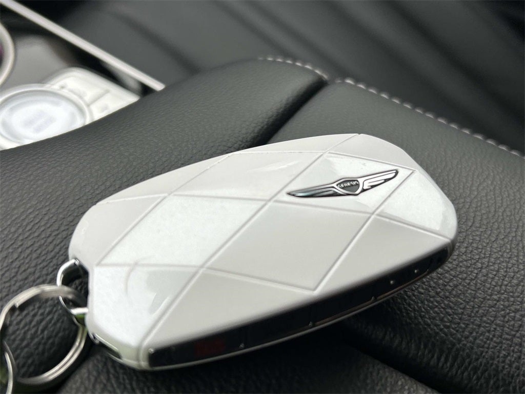 The full list of features includes: Option Group 01, 12 Speakers, 4-Wheel Disc Brakes, ABS brakes, Air Conditioning, Alloy wheels, AM/FM radio: SiriusXM, Anti-whiplash front head restraints, Auto High-beam Headlights, Auto tilt-away steering wheel, Auto-dimming door mirrors, Auto-dimming Rear-View mirror, Auto-leveling suspension, Automatic temperature control, Brake assist, Bumpers: body-color, Cargo Net, Compass, Delay-off headlights, Driver door bin, Driver vanity mirror, Dual front impact airbags, Dual front side impact airbags, Electronic Stability Control, Emergency communication system: Genesis Connected Services, Exterior Parking Camera Rear, First Aid Kit, Four wheel independent suspension, Fragrance Cartridge, Front anti-roll bar, Front Bucket Seats, Front Center Armrest, Front dual zone A/C, Front reading lights, Fully automatic headlights, Garage door transmitter: HomeLink, Heated door mirrors, Heated Front Bucket Seats, Heated front seats, Illuminated entry, Knee airbag, Leather steering wheel, Leatherette Seating Surfaces, Low tire pressure warning, Memory seat, Navigation System, Occupant sensing airbag, Outside temperature display, Overhead airbag, Overhead console, Panic alarm, Passenger door bin, Passenger vanity mirror, Power door mirrors, Power driver seat, Power Liftgate, Power passenger seat, Power steering, Power windows, Radio data system, Radio: AM/FM/SiriusXM/HD, Rain sensing wipers, Rear air conditioning, Rear anti-roll bar, Rear reading lights, Rear seat center armrest, Rear side impact airbag, Rear window defroster, Rear window wiper, Remote keyless entry, Security system, Speed control, Speed-sensing steering, Speed-Sensitive Wipers, Split folding rear seat, Spoiler, Steering wheel memory, Steering wheel mounted audio controls, Tachometer, Telescoping steering wheel, Tilt steering wheel, Traction control, Trip computer, Turn signal indicator mirrors, Variably intermittent wipers, and Wheels: 19 x 8.5J Medium Metallic Gray Alloy.